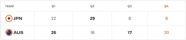 上半场日本女篮51-42领先,其中第二节打出29-16,但下半场风云突变,日本两节各得8分,被澳大利亚轰出37-16逆转比赛。